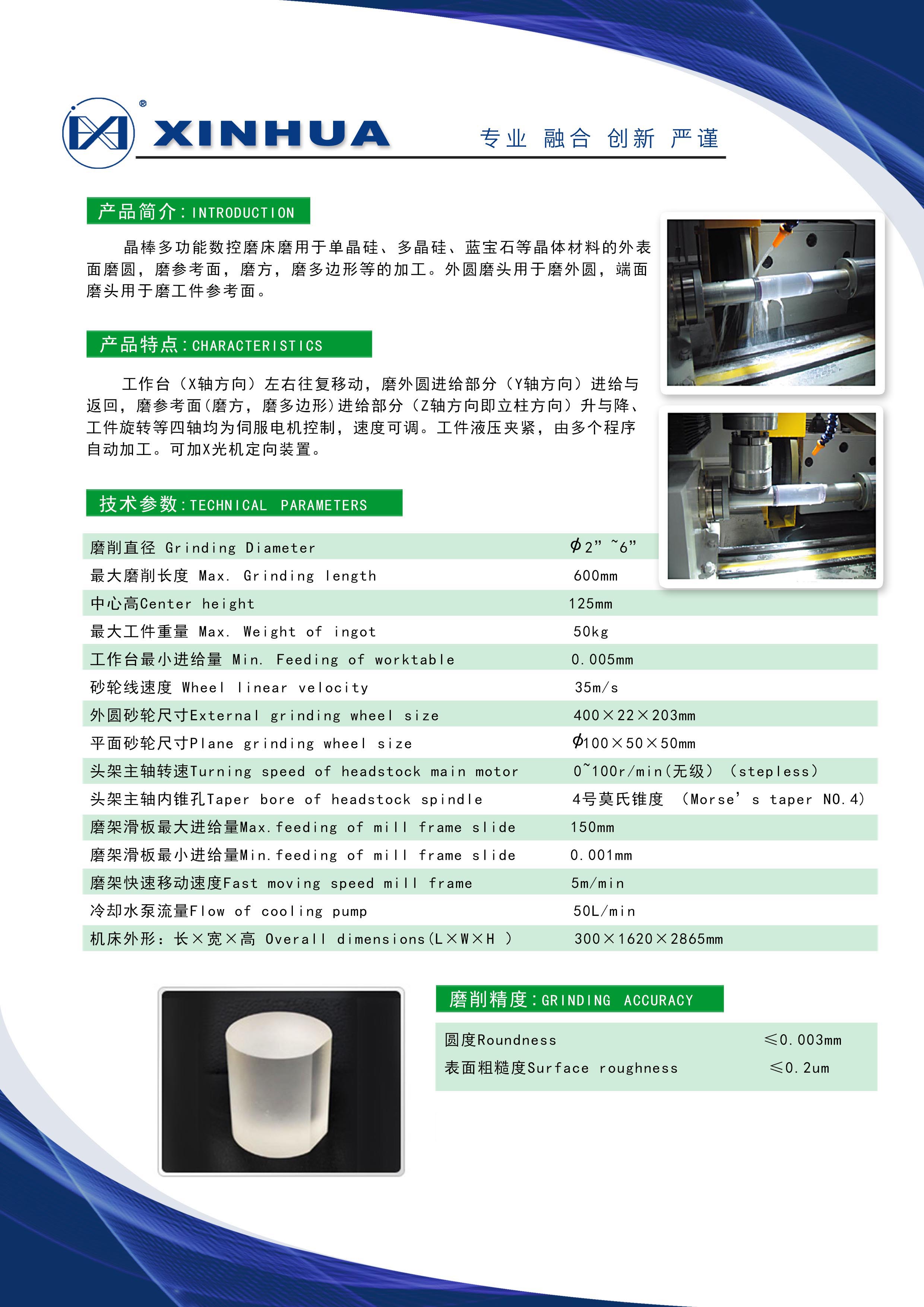 晶棒多功能數(shù)控磨床磨用于單晶硅、多晶硅、藍(lán)寶石等晶體材料的外表;面磨圓,磨參考面,磨方,磨多邊形等的加工。外圓磨頭用于磨外圓,端面磨頭用于磨工件參考面。